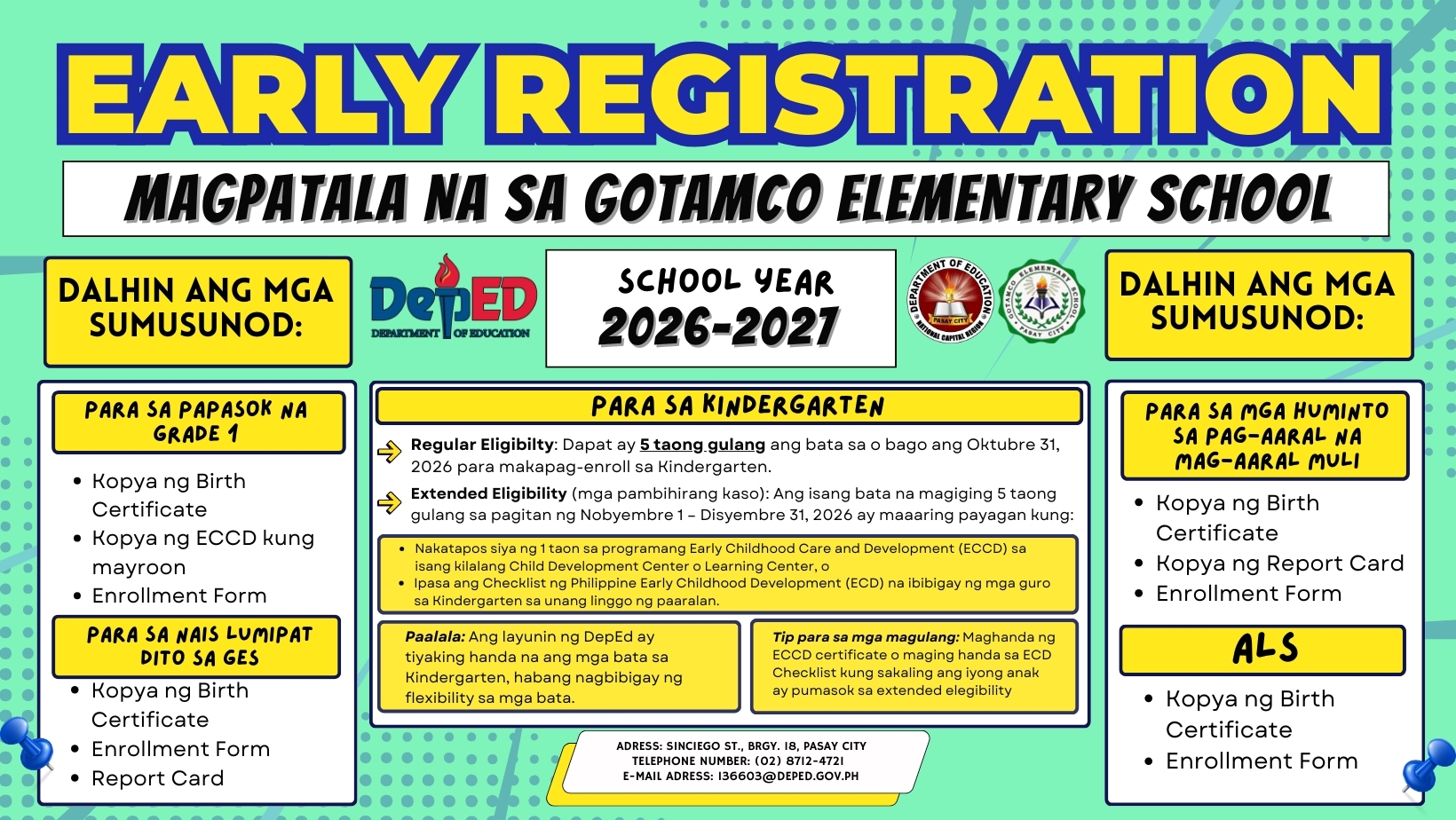 magpunta na sa gotamco elementary school at magpatala kung ikaw ay nagnanais na mag-aral. dalhin ang mga requirements na kailangan.